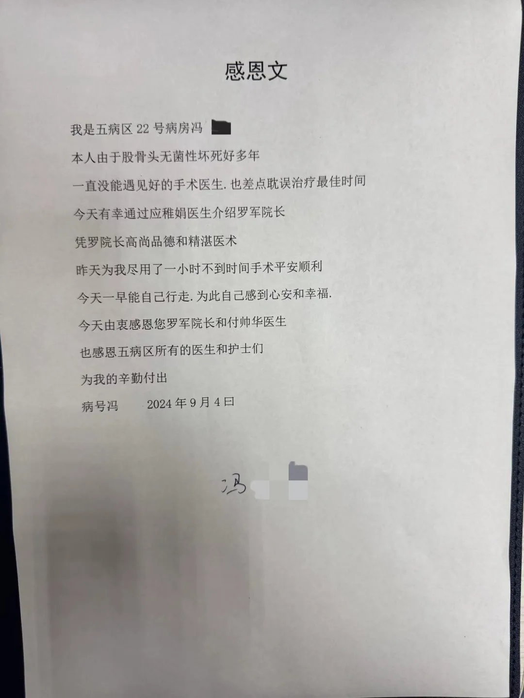 手術(shù)后12小時(shí),患者便可以自己行走?;颊呒雀屑び指袆?dòng),于9月4日送上感謝信,感謝羅軍副院長(zhǎng)和五病區(qū)的所有醫(yī)護(hù)!