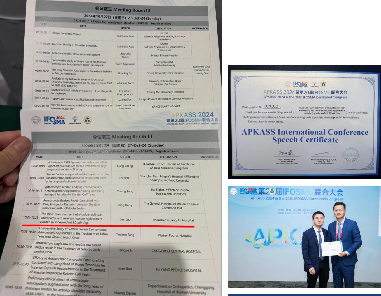 在會(huì)議上,羅軍主任作了“自主3D打印輔助反置式肩關(guān)節(jié)置換治療肩袖撕裂關(guān)節(jié)病的近期臨床療效”隨訪研究成果的學(xué)術(shù)報(bào)告。羅軍主任團(tuán)隊(duì)以其先進(jìn)的手術(shù)理念、豐富的臨床實(shí)踐和嚴(yán)謹(jǐn)?shù)目蒲袘B(tài)度,獲得了在場(chǎng)眾多專家及同仁的高度認(rèn)可和贊揚(yáng)。