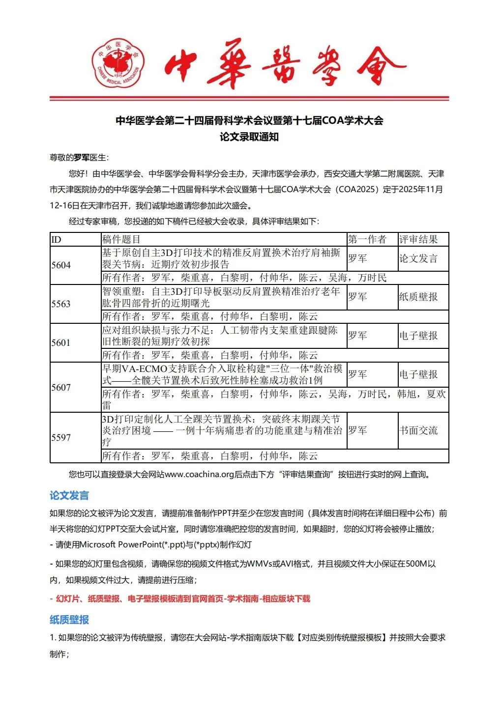 在COA大會上,“大會發(fā)言”環(huán)節(jié)旨在展示最具創(chuàng)新性和代表性的研究成果。獲得此資格,意味著該論文的學術水平和臨床價值得到了評審專家委員會的充分肯定。我院學者將在此環(huán)節(jié)與國內同行進行深度交流與探討,這也是我們向全國頂尖水平學習、汲取前沿知識的重要機會。