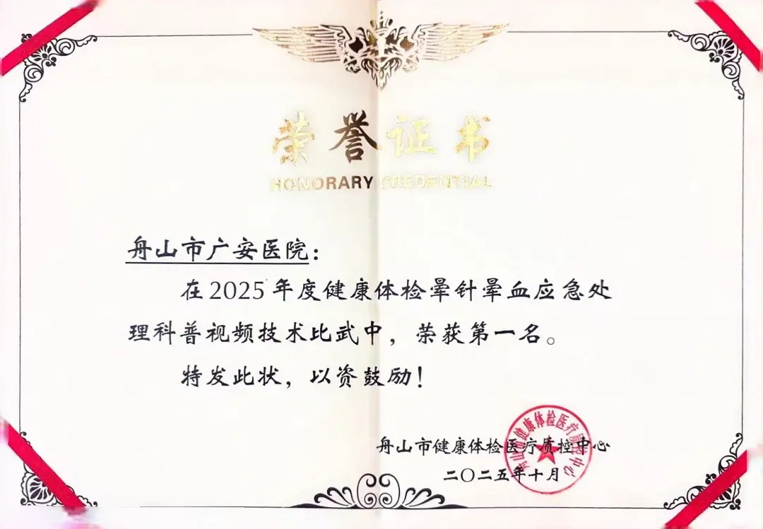 作為承擔海船船員體檢、職業(yè)健康體檢等多項任務的專業(yè)機構,舟山廣安醫(yī)院健康管理中心深知暈針暈血應急處置對保障體檢安全的重要性。中心依托一站式服務空間及先進醫(yī)療設備,由資深專業(yè)技術人員組建應急處置小組,日常通過定期培訓、情景演練等方式強化團隊能力,將“迅速反應、精準處置、人文關懷”的原則融入每一次服務中。此次比武獲獎,正是對中心應急處置規(guī)范化、專業(yè)化水平的充分認可。