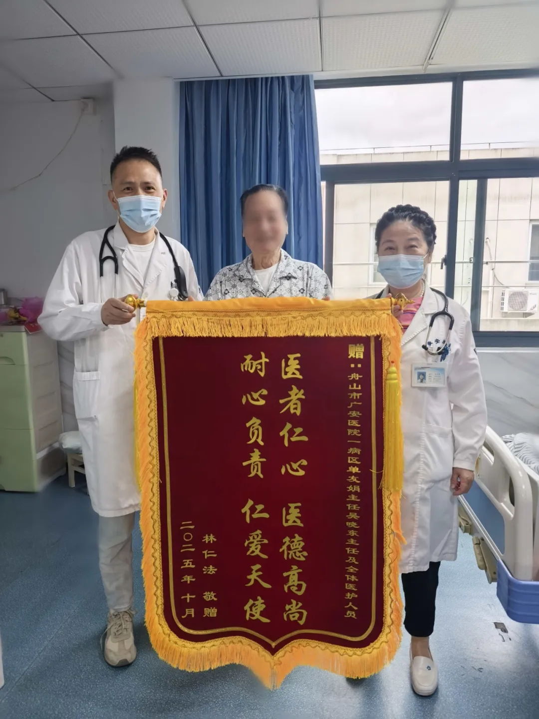 康復(fù)出院之際,激動(dòng)萬分的患者做了一件他思量已久的事——他將一面精心準(zhǔn)備的錦旗,鄭重地送到了單主任和吳主任的手中。