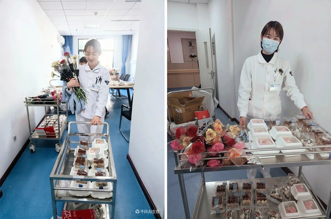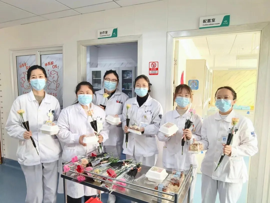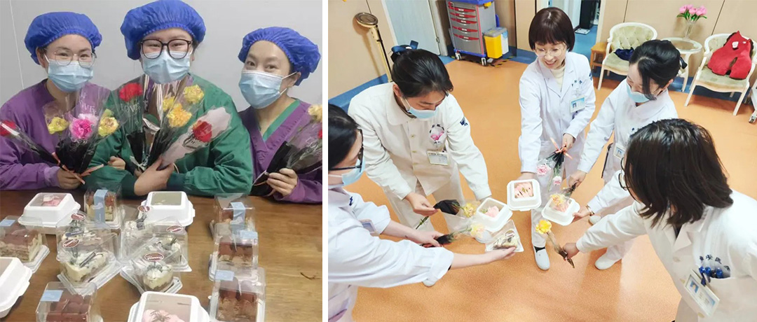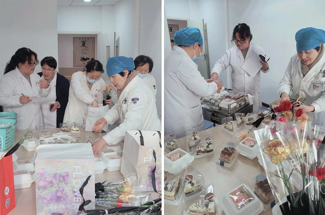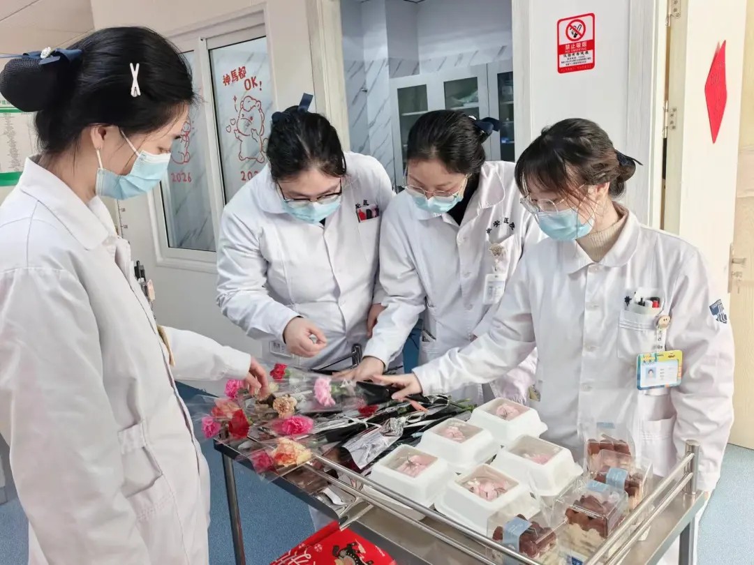 在繁忙的臨床科室,慰問組向醫(yī)護人員道一聲“辛苦了”;在細致的門診窗口,向耐心解答疑問的導診人員送上一束鮮花;在精密的醫(yī)技部門和忙碌的后勤崗位,同樣少不了這份節(jié)日的甜蜜。嬌艷的鮮花與香甜的蛋糕相映成趣,芬芳花香瞬間驅(qū)散了工作的疲憊。