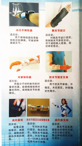不同部位的矯形器對(duì)應(yīng)不同的適應(yīng)癥,如動(dòng)態(tài)手矯形器的適用于橈神經(jīng)損傷導(dǎo)致伸肌功能癱瘓,可被動(dòng)伸展腕關(guān)節(jié);肘關(guān)節(jié)固定支架適用于肘關(guān)節(jié)攣縮,不穩(wěn)定,術(shù)后固定,肘不穩(wěn)定性骨折;