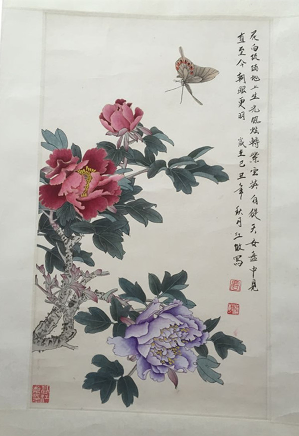 21日下午,在廣安醫(yī)院中醫(yī)正骨科辦公室,兩名醫(yī)生小心翼翼地展開- ~幅畫卷,畫上蝶繞牡丹,栩栩如生;花葉相扶,紅綠相襯。. 上面還賦有唐朝詩人元稹的一首《西明寺牡丹》:花向琉璃地上生,光風(fēng)炫轉(zhuǎn)紫云英。自從天女盤中見,直至今朝眼更明。