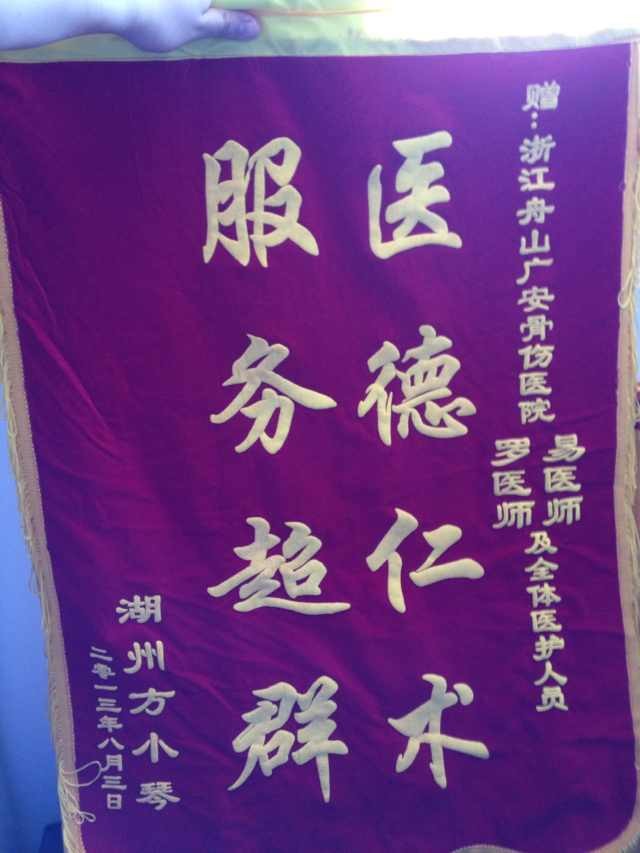 今年8月,時隔手術(shù)時間已經(jīng)一年了,方女士千里迢迢從湖州再次趕來我院,為的只是進(jìn)行內(nèi)固定拆除術(shù)。其實(shí)拆除手術(shù),是一個很簡單的手術(shù),在普通醫(yī)院都能完成??沙鲇趯ξ以旱男湃魏透屑?,方女士特地讓兒子開車從湖州趕到舟山。手術(shù)結(jié)束后,方女士顯得激動萬分。她說:感謝廣安醫(yī)院醫(yī)生護(hù)士的高超技術(shù)以及細(xì)心照顧,讓我的腿恢復(fù)的這么好。雖然湖州離舟山要好幾個小時的車程,可是我不覺得辛苦,因?yàn)槲抑肋@里有最好的醫(yī)生護(hù)士等著我,我對他們的技術(shù)與服務(wù)感到非常的放心。這面錦旗不值錢,可卻代表了我對廣安醫(yī)院的感激之情。