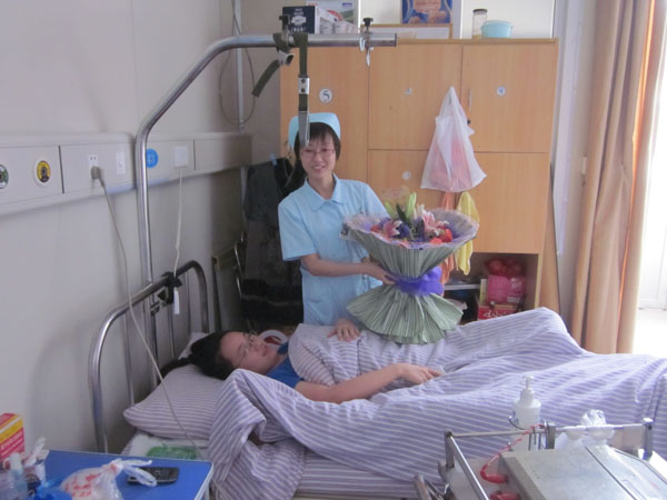 護(hù)士長(zhǎng)吳冰冰手捧鮮花送給病人