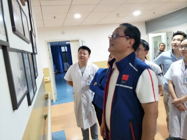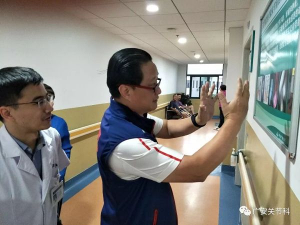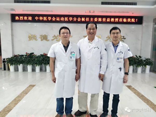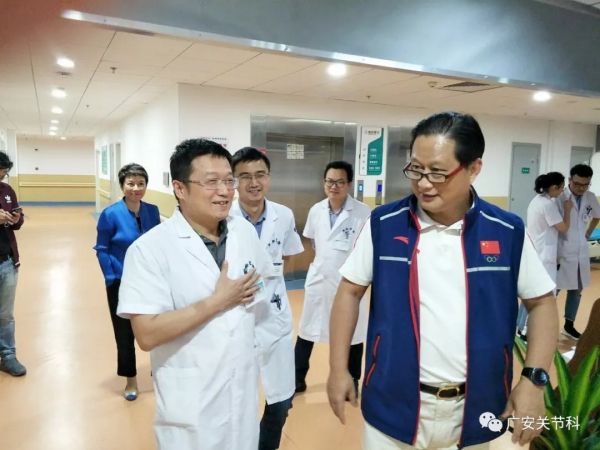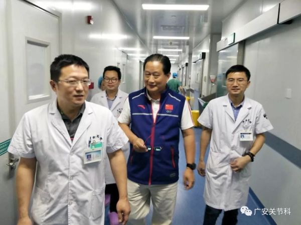 首先陳世益教授參觀廣安醫(yī)院運動醫(yī)學科病區(qū),陳教授仔細的詢問科室的病床數(shù),收治病人的情況,運動醫(yī)學科的手術(shù)量及手術(shù)種類,當了解到廣安醫(yī)院運動醫(yī)學科年平均關(guān)節(jié)鏡手術(shù)量在500余臺,肩關(guān)節(jié)鏡手術(shù)量近百臺,并開展了許多運動醫(yī)學領(lǐng)域高難度的手術(shù),不禁連聲稱贊!陳教授充分肯定了廣安醫(yī)院運動醫(yī)學科取得的成績,并勉勵大家再接再厲,更上一層樓。