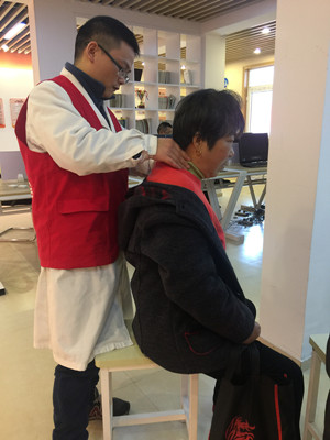 康復(fù)科主任劉良勇醫(yī)生的攤點(diǎn)前也排起了長(zhǎng)隊(duì),他也耐心地為每一位患者推拿,告知他們?nèi)粘5目祻?fù)訓(xùn)練