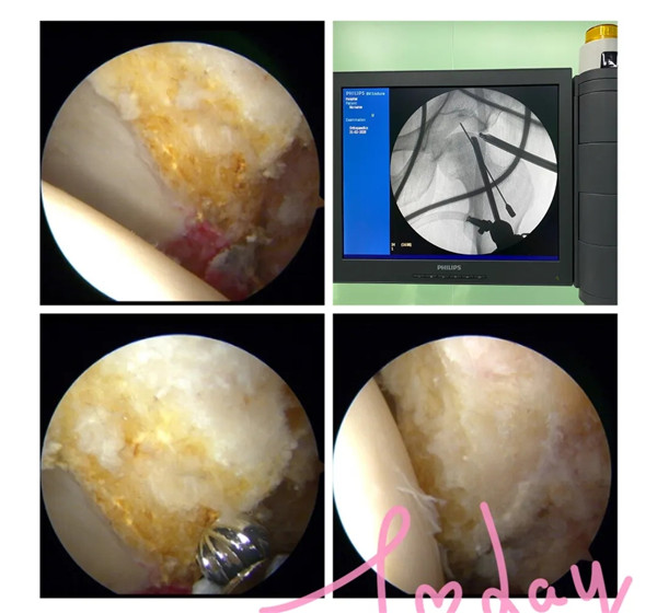 2月21日,經(jīng)過(guò)周密的術(shù)前準(zhǔn)備,羅軍帶領(lǐng)手術(shù)團(tuán)隊(duì)為余大伯開展髖關(guān)節(jié)鏡手術(shù)。術(shù)中,完成了髖關(guān)節(jié)鏡下探查清理、頭頸成形術(shù),髖關(guān)節(jié)鏡下清理術(shù),順利去除了髖關(guān)節(jié)撞擊征及盂唇破裂等病灶,并聯(lián)合運(yùn)用富血小板血漿技術(shù)治療患者的股骨頭壞死。