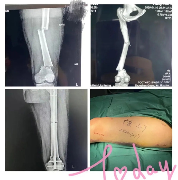 受傷的是家住城北的年輕小伙小王,早上騎電動車去上班速度太快而不慎摔傷。急診醫(yī)生初步檢查,判斷是大腿骨骨折,立即予以拍片檢查。結(jié)果顯示:左股骨多段粉碎性骨折。小王左腿股骨竟斷成三截 !須做手術(shù)治療。病人和家屬看到片子后,都有點嚇傻了,急得語無倫次,不斷地追問醫(yī)生:“醫(yī)生,這該怎么辦呢?骨頭都斷這樣了,還能接好嗎?……”醫(yī)生趕緊安撫病人和家屬:“到了我們醫(yī)院,您們放心好了。等檢查完善后,我們會盡快施行手術(shù)治療的”。小王當(dāng)即辦理了住院手續(xù)。