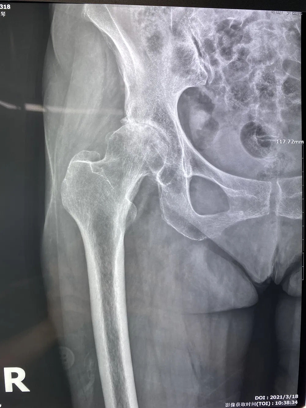↑術(shù)前拍片提示右股骨頭壞死,髖關(guān)節(jié)骨性關(guān)節(jié)炎