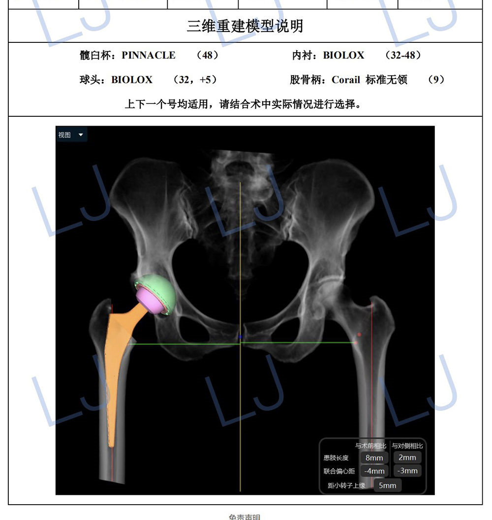 人工智能輔助全髖關(guān)節(jié)置換手術(shù)解決方案(AI HIP),基于術(shù)前CT圖像,實現(xiàn)三維重建解剖模型,智能識別解剖位點,并根據(jù)股骨及髖臼的解剖形態(tài),智能匹配最適假體類型、型號大小及安放位置,給術(shù)者提供最優(yōu)的個性化定制手術(shù)方案,以便最大程度重建并恢復(fù)患側(cè)髖關(guān)節(jié)的肢體長度、偏心距、宿主骨覆蓋等,同時降低術(shù)后關(guān)節(jié)脫位率。該技術(shù)對于關(guān)節(jié)置換手術(shù)的術(shù)前精準規(guī)劃和術(shù)中精準操作有重要指導(dǎo)的意義。