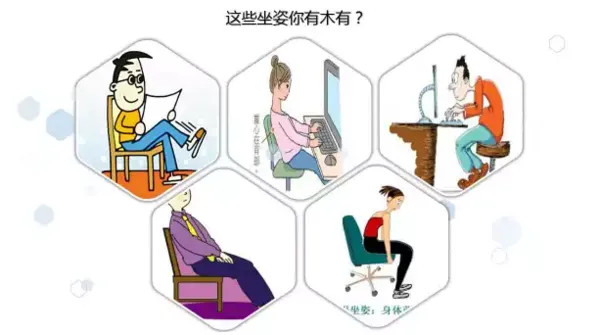 行走坐立時(shí)應(yīng)保持姿勢(shì)端正,不要弓腰、駝背、蹺二郎腿等等不良姿勢(shì);長(zhǎng)期低頭看手機(jī)或伏案工作的人,最好每半個(gè)小時(shí)休息活動(dòng)一下。