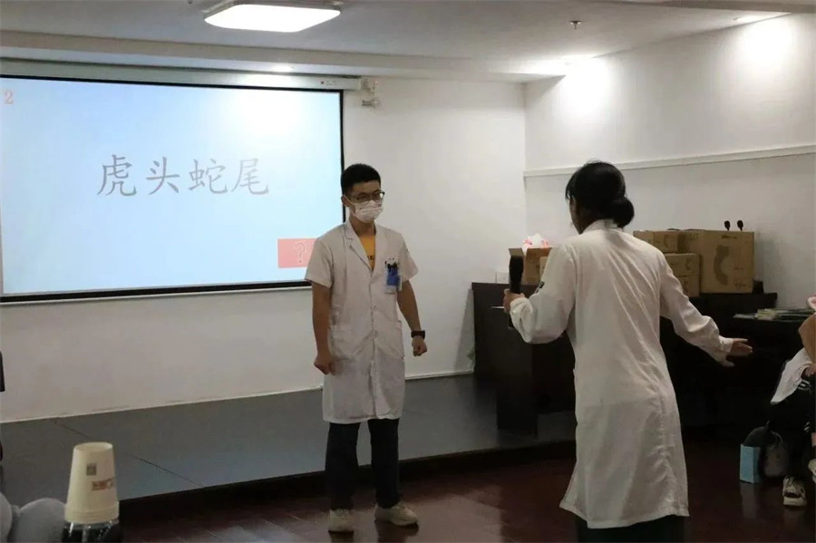 這一次題目內(nèi)容涵蓋醫(yī)療專業(yè)名詞、成語、古詩,難度系數(shù)可不是一般的大,看著比劃者手舞足蹈,猜詞者卻一頭霧水,場下觀眾可是比臺(tái)上參賽者都著急,有人出主意,有人大笑,場面熱鬧非凡。最終裴燕和鄧佳婧憑借多年默契,拿下全場最佳。