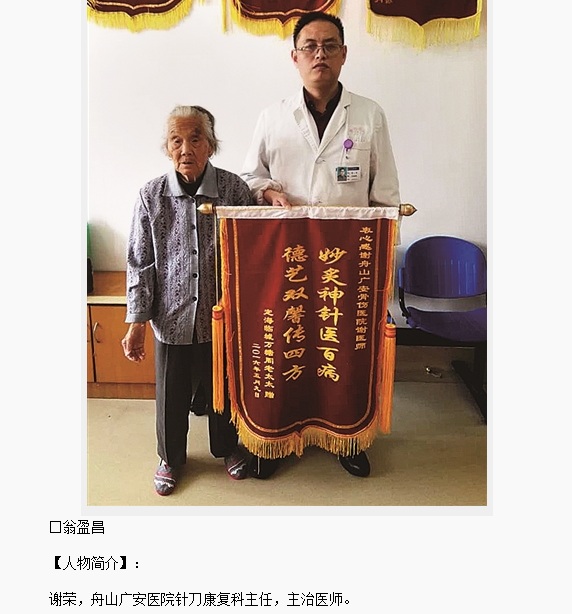 54歲患者蔡女士,年幼時,因長期側(cè)睡體位,造成斜頸。謝榮用小針刀治療不到5分鐘,斜頸明顯改善了,病人甚是高興。沈家門黃老太太,因為痛風(fēng)- -周不能走路,謝醫(yī)生用針灸加中藥外敷,第二天就可以下地走路。平陽浦57歲的張老漢,因為多發(fā)性神經(jīng)炎,不能走路,生活不能自理,大醫(yī)院醫(yī)生說這病看不好。快要絕望之時,去年6月來到廣安醫(yī)院接受謝醫(yī)生治療,-一個月后,能行走,生活能自理。