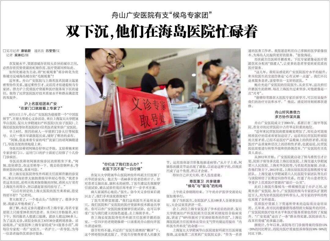 此后,上海醫(yī)生像候烏一樣頻頻往返于舟滬之間,定期坐診廣安醫(yī)院。如今,廣安醫(yī)院的候鳥專家團隊擴展到近百人,均為知名醫(yī)院的學科帶頭人,而專家的學科結構也實現(xiàn)了全科覆蓋。