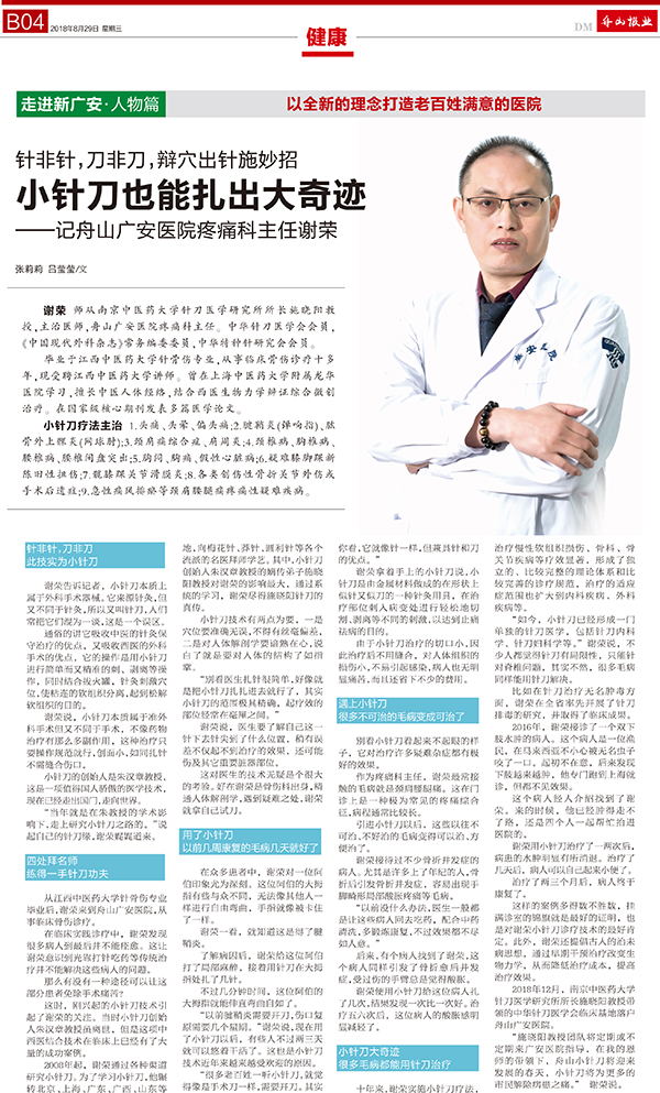 謝榮,師從南京中醫(yī)藥大學(xué)針刀醫(yī)學(xué)研究所所長施曉陽教授,主治醫(yī)師,舟山廣安醫(yī)院疼痛科主任。中華針刀醫(yī)學(xué)會會員,《中國現(xiàn)代外科雜志》常務(wù)編委委員,中華特種針研究會會員。