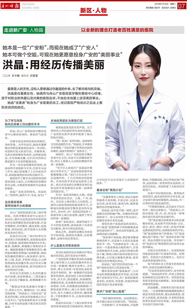 洪晶是位愛美女性,她偶然與舟山廣安醫(yī)院醫(yī)學(xué)整形美容中心結(jié)緣,源于對職業(yè)的熱愛以及對美的極致追求,不由自主地愛上這項美麗事業(yè)。