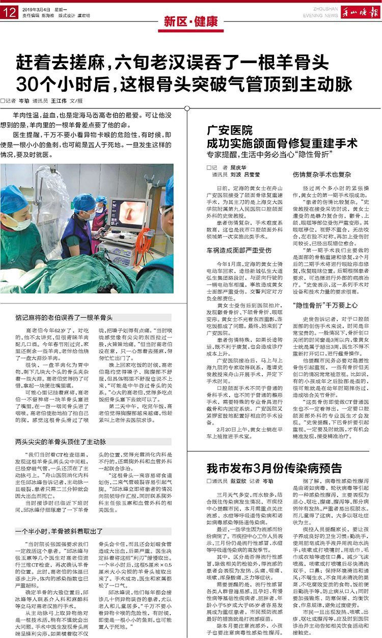 日前,定海的黃女士在舟山廣安醫(yī)院接受了頜面骨修復重建手術(shù),為其主刀的是上海交大醫(yī)學院附屬第九人民醫(yī)院口腔頜面外科的史俊教授。