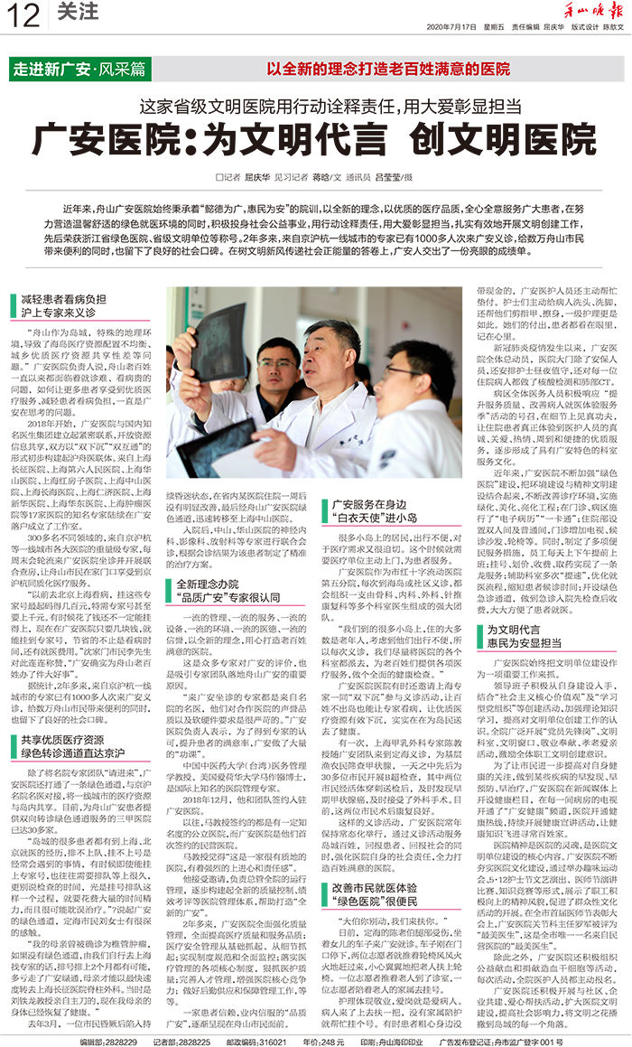 廣安人懷揣著對于醫(yī)療的敬畏和對舟山人的大愛,將以更加昂揚(yáng)的姿態(tài)和海納百川的胸懷,不斷把學(xué)科建設(shè)和醫(yī)療技術(shù)水平推向更高的境界,服務(wù)舟山、造福社會。