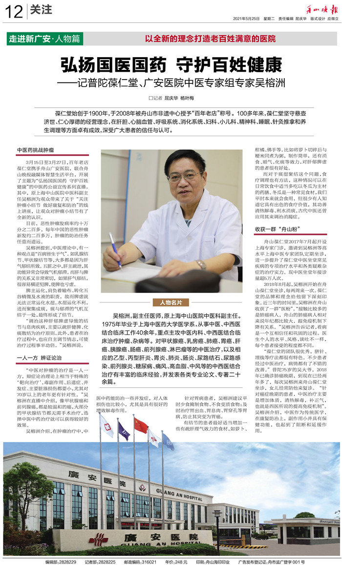 廣安人懷揣著對于醫(yī)療的敬畏和對舟山人的大愛,將以更加昂揚的姿態(tài)和海納百川的胸懷,不斷把學(xué)科建設(shè)和醫(yī)療技術(shù)水平推向更高的境界,服務(wù)舟山、造福社會。