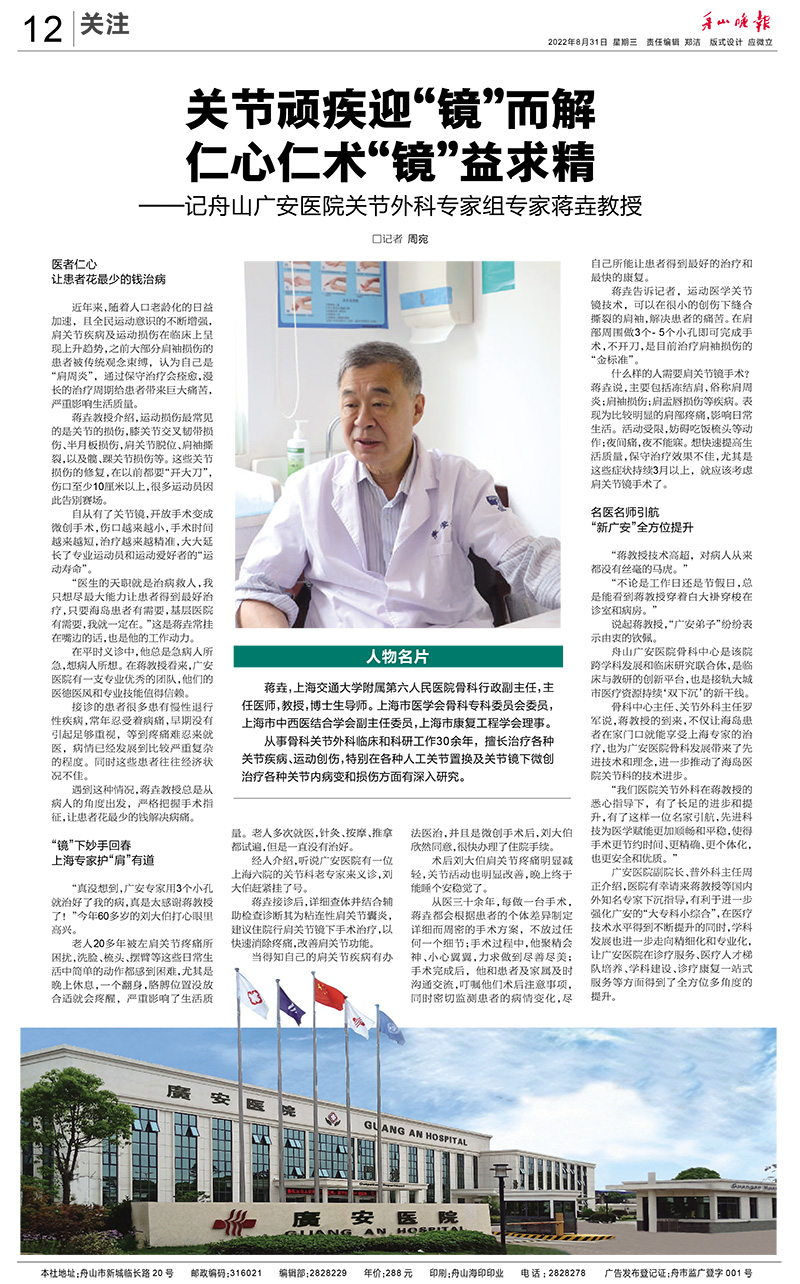 廣安人懷揣著對于醫(yī)療的敬畏和對舟山人的大愛,將以更加昂揚(yáng)的姿態(tài)和海納百川的胸懷,不斷把學(xué)科建設(shè)和醫(yī)療技術(shù)水平推向更高的境界,服務(wù)舟山、造福社會。