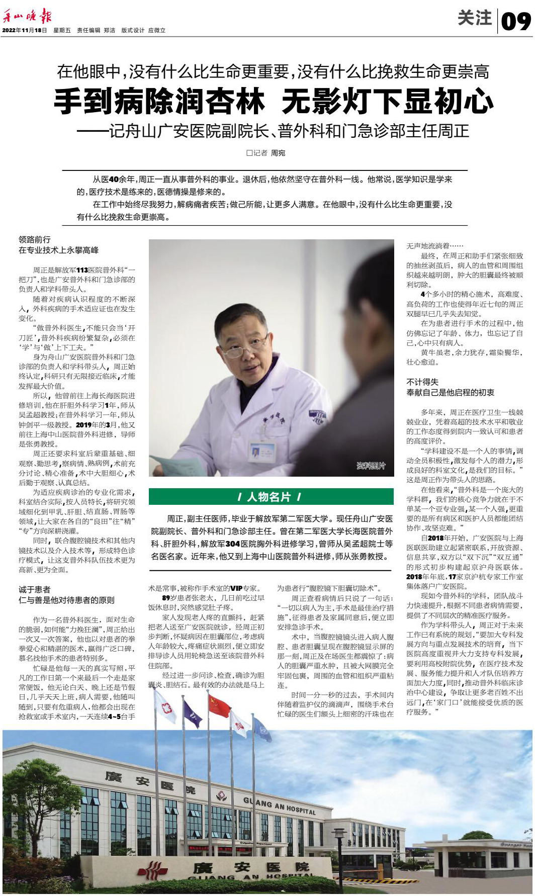 手到病除潤杏林 無影燈下顯初心——記舟山廣安醫(yī)院副院長、普外科和門急診部主任周正