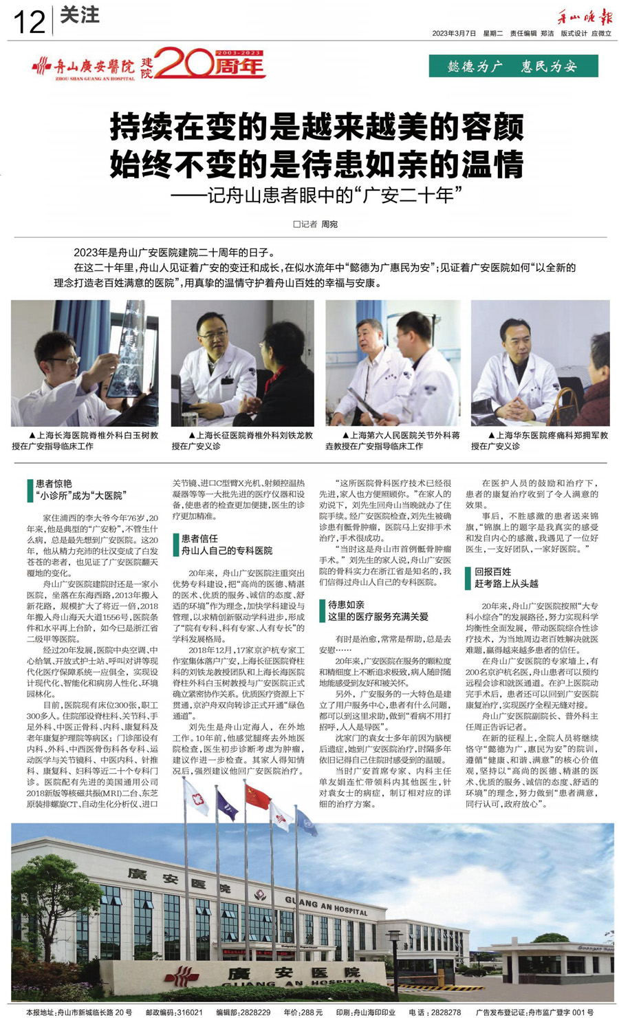 廣安人懷揣著對于醫(yī)療的敬畏和對舟山人的大愛,將以更加昂揚的姿態(tài)和海納百川的胸懷,不斷把學科建設和醫(yī)療技術水平推向更高的境界,服務舟山、造福社會。